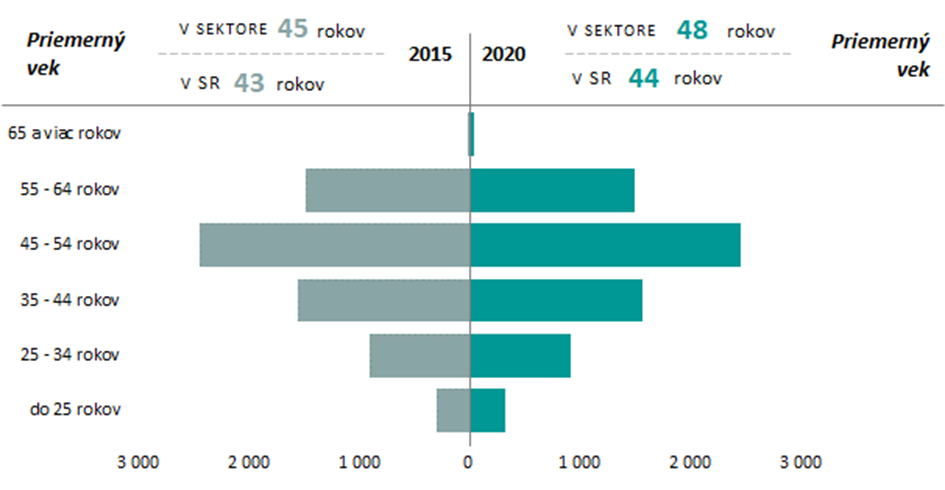 Z hľadiska veku zamestnancov patrí sektor medzi staršie sektory. Vyšší priemerný vek majú zamestnanci v 17 % sektorov. Priemerný vek zamestnancov v sektore je o 4 roky vyšší ako v SR. V celej SR má 24 % zamestnancov 55 a viac rokov, v sektore je ich podiel na úrovni 31 %. Ak sektor definujeme podľa sektorových zamestnaní, priemerný vek zamestnancov je nižší, na úrovni 46 rokov.
