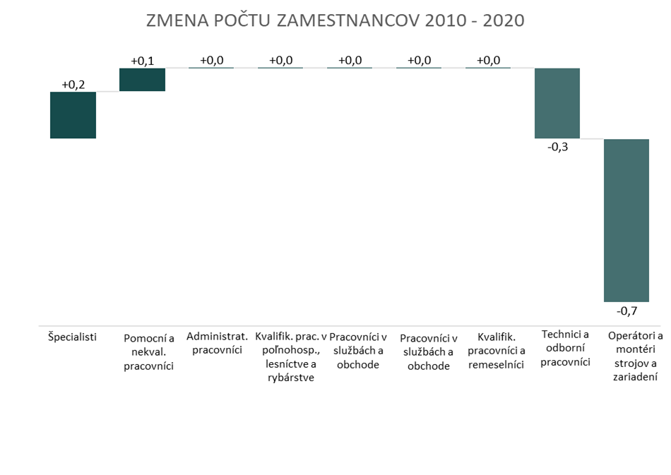 V sektore je podpriemerný podiel pracovných miest s potrebou vysokej kvalifikácie. Z celkového počtu pracovných miest v sektore tvoria manažérske pozície a pozície pre špecialistov 10 %. Ich podiel za posledných 10 rokov vzrástol o 3 p. b. Najviac zamestnancov pracuje v hlavných triedach zamestnaní 8 Operátori a montéri strojov a zariadení a 7 Kvalifikovaní pracovníci a remeselníci, ktoré spolu majú na celkovej zamestnanosti sektora 64 %-ný podiel. Pri porovnaní s rokom 2010 sa najvýraznejšie zvýšil počet zamestnancov v hlavnej triede zamestnaní 2 Špecialisti, kde bol zaznamenaný nárast o 61 %. Najvýraznejší pokles v počte zamestnancov zaznamenáva hlavná trieda zamestnaní 8 Operátori a montéri strojov a zariadení, kde za posledných 10 rokov poklesol počet zamestnancov o 21 %.