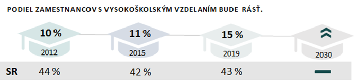 Podiel vysokoškolsky vzdelaných zamestnancov v sektore rastie. Za 8 rokov vzrástol ich podiel o 5 p. b. na súčasných 15 %. Sektor tak patrí medzi 13 % sektorov s najnižším podielom vysokoškolsky vzdelaných zamestnancov, resp. najvyšším podielom stredoškolsky vzdelaných zamestnancov. Sektor zamestnáva 0,1 % všetkých vysokoškolsky vzdelaných zamestnancov v SR a 0,6 % všetkých stredoškolských. Pri definícii sektora podľa sektorových zamestnaní má vysokoškolské vzdelanie 16 % zamestnancov sektora.