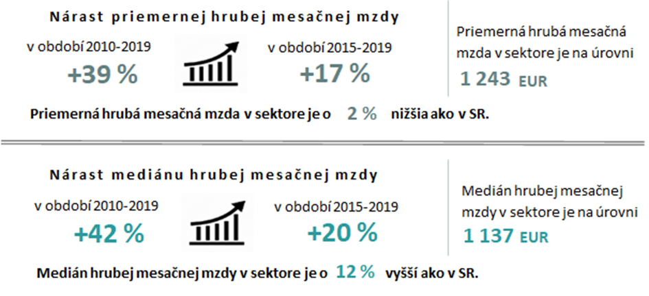 Za uplynulých 10 rokov vzrástli mzdy o 39 %, čo predstavuje 9 %-ný priemerný medziročný rast. Rast miezd v sektore tak vykazuje nižšiu dynamiku ako v podmienkach SR. V zahraničných spoločnostiach v sektore sú mzdy o 14 % vyššie ako v tuzemských.