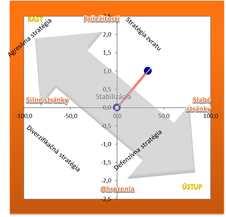 Ako vyplýva z grafu, jedná sa o pozíciu zvratu alebo WO. Tu je vhodná reštrukturalizácia, t. j. zamerať sa na rozvoj zamestnancov s odborným vzdelaním, ktorých je pre zvládnutie plánovaných úloh nedostatok. Je potrebné sa zamerať na odstránenie hlavných slabých stránok a súčasne sa zamerať na využitie príležitostí. Preto je vhodné sa zamerať na slabé stránky, ktoré majú najväčší dopad na ľudské zdroje. Je potrebné vytvorenie pozitívneho obrazu o slovenskom baníctve, moderných baniach/lomoch a o potrebe surovín pre udržateľný rozvoj. Elimináciou slabých stránok nie je ešte možné sa presunúť do pozície rastu, ale v prípade, že odstránené slabé stránky sa stanú silnými stránkami, tak sa môže jednať o rastové stratégie.