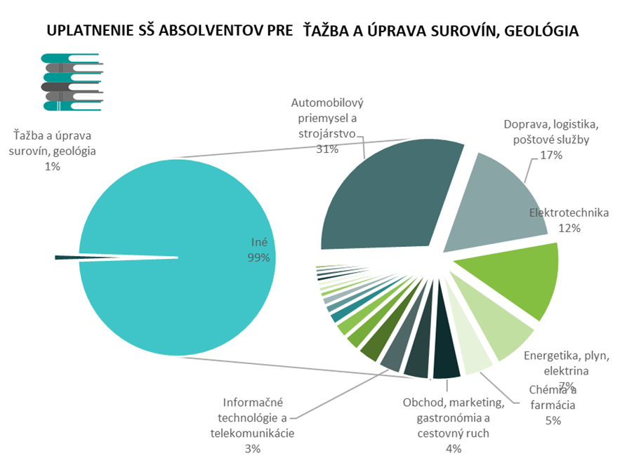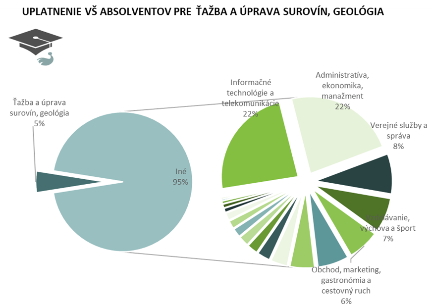 Z celkového počtu absolventov prichádzajúcich na trh práce pre sektor ťažba a úprava surovín, geológia sa 1 % uplatňuje v tomto sektore a zvyšných 99 % si nachádza zamestnanie v iných sektoroch (definované podľa sektorových zamestnaní). Pri stredoškolských absolventoch sa uplatňuje v sektore 1 % a pri vysokoškolských absolventoch 5 %. Hlavnými sektormi (mimo tohto sektora) využívajúcimi absolventov pre sektor ťažba a úprava surovín, geológia sú pri vysokoškolákoch informačné technológie a telekomunikácie (22 %) a administratíva, ekonomika, manažment (22 %) a stredoškolákoch automobilový priemysel a strojárstvo (31 %) a doprava, logistika, poštové služby (17 %).