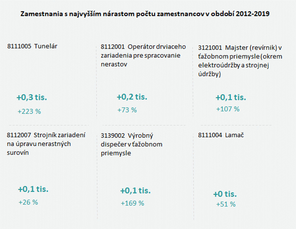 Najväčší nárast počtu zamestnancov v sektore ťažba a úprava surovín, geológia zaznamenávajú nízkokvalifikované zamestnania. V zamestnaní 8111005 Tunelár bol zaznamenaný za posledných sedem rokov nárast o 223 %, resp. približne o 300 osôb.