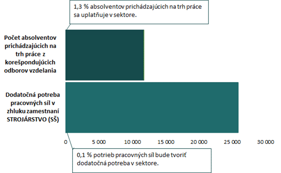 Najviac, približne 20 osôb v sektore ťažba a úprava surovín, geológia bude potrebných v zhluku zamestnaní STROJÁRSTVO (SŠ). Popritom do roku 2025 príde na trh práce približne 11,7 tisíc absolventov, ktorí ukončia štúdium v niektorom z korešpondujúcich odborov vzdelania vhodných pre výkon zamestnaní patriacich do tohto zhluku zamestnaní. Z absolventov prichádzajúcich na trh práce, sa v sektore uplatňuje približne 1 %, v sektore sa tak do roku 2025 v tomto zhluku očakáva mierny prebytok absolventov.