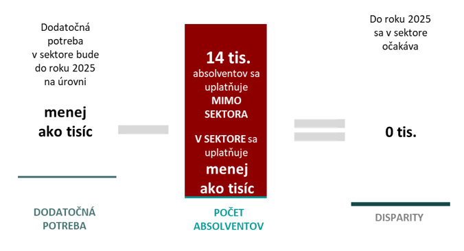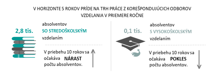 V období rokov 2021 – 2025 príde na trh práce 14,6 tisíc absolventov stredných a vysokých škôl, ktorí ukončia štúdium v niektorom z korešpondujúcich odborov vhodných pre výkon zamestnaní v tomto sektore a nebudú pokračovať v štúdiu. Približne 97 % z prichádzajúcich absolventov budú tvoriť absolventi stredných škôl, podiel absolventov vysokých škôl bude na úrovni 3 %. V dlhšom horizonte, v nasledujúcich 10 rokoch sa očakáva nárast počtu stredoškolských absolventov.