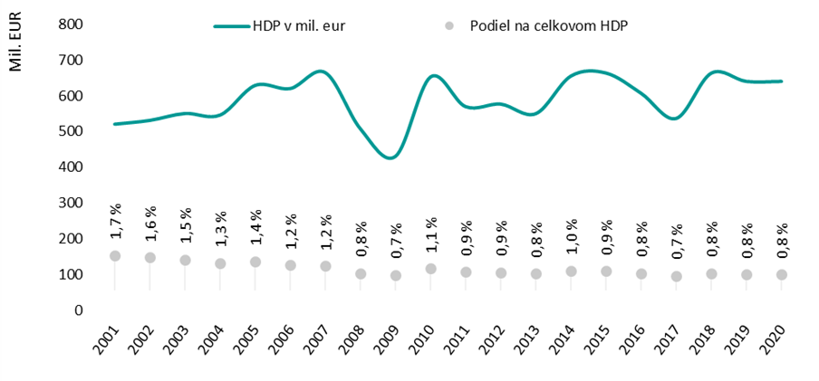 Sektor má v súčasnosti 0,8 %-ný podiel na tvorbe HDP v SR a tento podiel z dlhodobého pohľadu mierne klesá (Graf č. 1). Z hľadiska tvorby HDP tak patrí medzi top 8 % sektorov s najnižším príspevkom k tvorbe HDP. Sektor má v 8 krajinách EÚ dominantnejší podiel na tvorbe HDP ako v SR. Najvýznamnejšie postavenie má sektor v krajinách Portugalsko (2 %), Rumunsko (2 %). Slovenská republika sa nachádza medzi 33 % krajinami EÚ s najvyšším podielom tohto sektora na celkovom HDP.