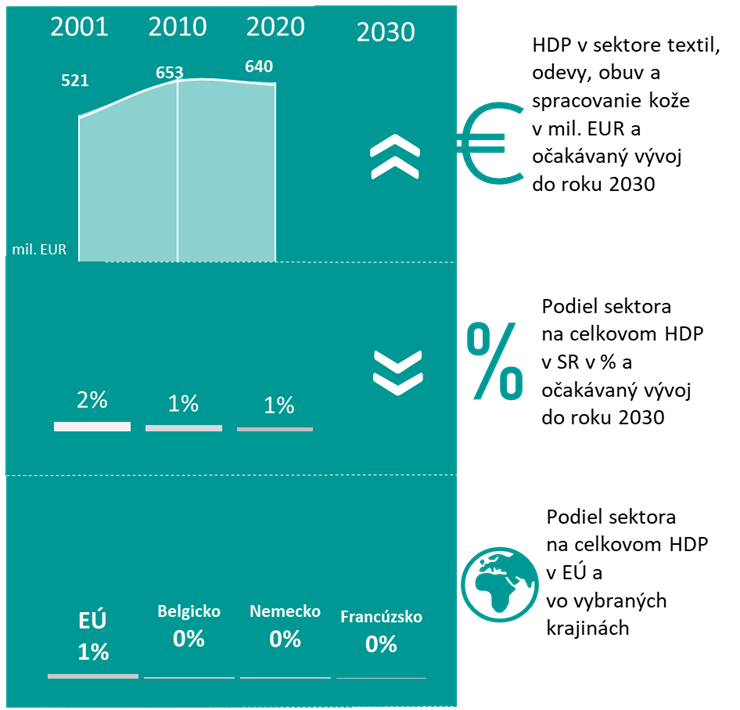 Vývoj HDP v sektore textil, odevy, obuv a spracovanie kože v mil. EUR a podiel sektora na celkovom HDP v období 2001 – 2020