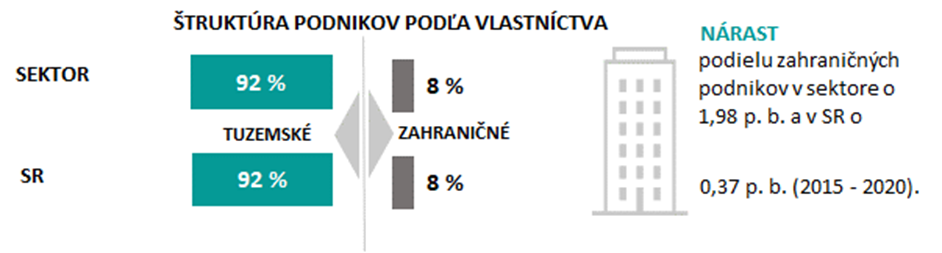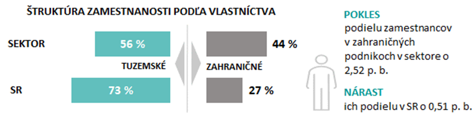 V sektore dominujú tuzemské podniky s 92 %-ným zastúpením (Schéma č. 3) a 56 %-ným podielom na zamestnanosti sektora (Schéma č. 4). V sektore tak pracuje väčšia časť zamestnancov v tuzemských podnikoch. V porovnaní s rokom 2015 podiel zahraničných podnikov v sektore vzrástol o 2 p. b. a záujem zahraničných investorov rastie.