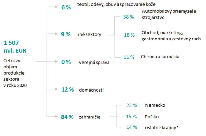 Najdominantnejšou kategóriou spotrebiteľov produkcie je zahraničie s 84 % podielom na celkovej spotrebe produkcie sektora. Do zahraničia smeruje 84 % produkcie, z toho 27 % je vstupom do ďalšieho výrobného procesu v zahraničí. Sektor tak produkuje 2 % pre domácu finálnu spotrebu, 61 % pre finálnu spotrebu v zahraničí, 14 % pre domácu medzispotrebu a 23 % pre medzispotrebu v zahraničí. Hlavnými spotrebiteľmi produkcie v zahraničí sú Nemecko, Poľsko a ostatné krajiny (Schéma č. 5). Medzi ostatné krajiny spadajú viaceré väčšie a menšie ekonomiky mimo EÚ. Najväčšími obchodnými partnermi SR spomedzi týchto krajín sú: Ukrajina, Vietnam, Srbsko, Malajzia a Egypt.
