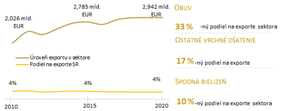Štruktúra vývozu podľa divízií patriacich do tohto sektora je nasledovná: 13 Výroba textilu (19,3 %), 14 Výroba odevov (40,1 %), 15 Výroba kože a kožených výrobkov (40,6 %).