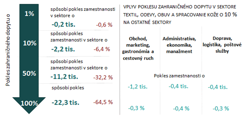 Zamestnanosť sektora textil, odevy, obuv a spracovanie kože závisí od dopytu po tovaroch a službách nielen tohto sektora, ale aj zahraničia a ostatných sektorov. Pokles finálneho zahraničného dopytu po tuzemských produktoch sektora o 10 % spôsobí pokles zamestnanosti v sektore o 6,4 %, čo predstavuje pokles približne o 2,2 tisíc zamestnancov. Poklesom dopytu sú však nepriamo ovplyvnené aj subdodávateľské sektory, predovšetkým sektory obchod, marketing, gastronómia a cestovný ruch a administratíva, ekonomika, manažment.