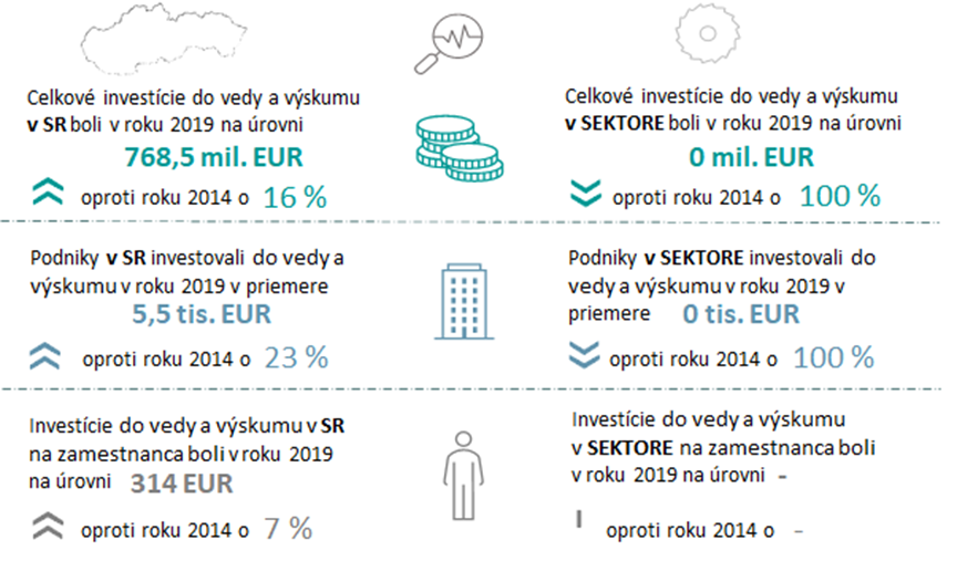V roku 2019 podniky v sektore textil, odevy, obuv s pracovanie kože vôbec neinvestovali do vedy a výskumu (Obrázok č. 1). Sektor má podpriemerné investície do vedy a výskumu. Tvorí 0 % celkových výdavkov do vedy a výskumu v SR. Výdavky do vedy a výskumu v sektore klesajú.