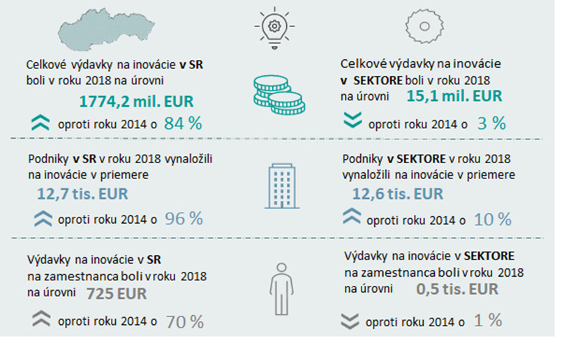 Nemenej dôležité sú výdavky na inovácie. Sektor investuje do inovácií v priemere 12,6 tis. EUR na podnik, čo je o 1 % menej ako je národný priemer. Celkovo sa sektor podieľa na celkových výdavkoch do inovácií v SR 1 %-om (Obrázok č. 2).