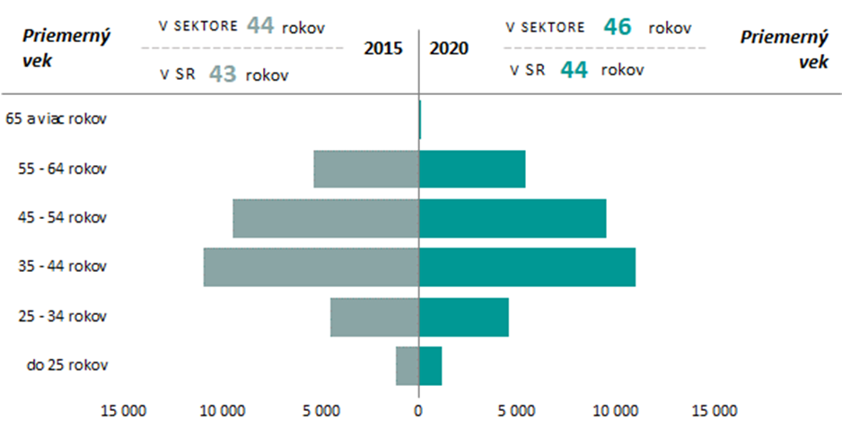 Veková štruktúra zamestnancov v sektore prevyšuje celoslovenský priemer. Vyšší priemerný vek majú zamestnanci v 42 % sektorov. Priemerný vek zamestnancov v sektore je o 2 roky vyšší ako v SR. V celej SR má 24 % zamestnancov 55 a viac rokov, v sektore je ich podiel na úrovni 23 %. Ak sektor definujeme podľa sektorových zamestnaní, priemerný vek zamestnancov je taktiež na úrovni 46 rokov (Graf č. 6).