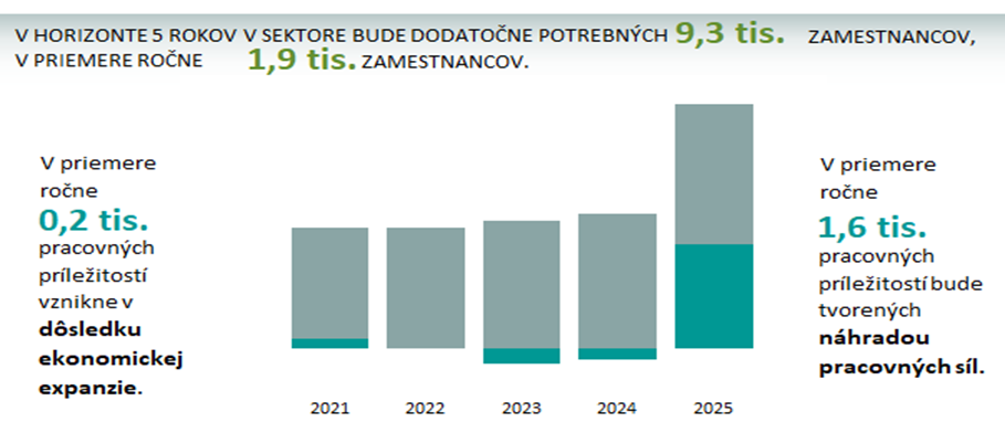 Dodatočná potreba zamestnancov v sektore verejnej správy (zohľadňujúca počty zamestnancov v preddôchodkovom veku, ako aj trend mierneho zvyšovania zamestnanosti v sektore) by v období rokov 2021 – 2025 mala byť na úrovni približne 9,3 tisíc osôb. Pri analýze dodatočnej potreby ľudských zdrojov je dôležité poznať aj to, akým spôsobom budú na trhu práce vznikať dodatočné pracovné príležitosti. V období rokov 2021 – 2025 bude pri potrebe dodatočných pracovných príležitostí vo verejnej správe dominovať náhrada ľudských zdrojov, ktorá bude tvoriť v priemere 88 % celkovej dodatočnej potreby ľudských zdrojov vo verejnej správe. V sektore verejné služby a správa tak vznikne v priemere ročne 1,6 tisíc pracovných príležitostí v dôsledku nutnosti náhrady ľudských zdrojov.