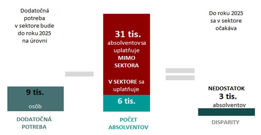 | Kód a názov odboru vzdelania | Stupeň vzdelania | Počet žiakov/študentov v odbore v školskom roku 2020/2021 | Počet absolventov prichádzajúcich na trh práce v SR v rokoch 2021 – 2025 | Podiel absolventov pracujúcich v sektore v roku 2020 z celkového počtu absolventov odboru | Podiel zamestnaných s absolvovaným odborom vzdelania z celkového počtu zamestnaných v sektore v roku 2020 |