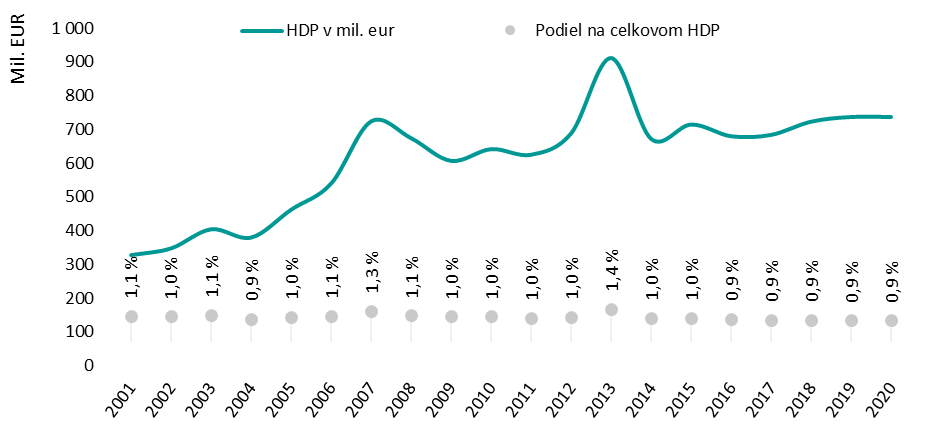Sektor má v súčasnosti 0,9 %-ný podiel na tvorbe HDP v SR a tento podiel z dlhodobého pohľadu mierne klesá. Z hľadiska tvorby HDP tak patrí medzi top 21 % sektorov s najnižším príspevkom k tvorbe HDP.