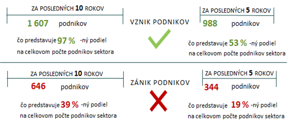 Za posledných 5 rokov pripadalo na 100 existujúcich podnikateľských subjektov 53 novovzniknutých a 19 zaniknutých podnikateľských subjektov. Najväčší podiel vznikajúcich subjektov bol zaznamenaný v divízii 38. V dlhodobom horizonte dynamika vzniku podnikateľských subjektov rastie a rastie aj počet zaniknutých podnikov. V porovnaní so SR sa sektor vyznačuje nižšou dynamikou vzniku a zániku podnikateľských subjektov. Prevažnú časť vzniknutých podnikateľských subjektov predstavujú spoločnosti s ručením obmedzeným (63 %) a zaniknutých podnikateľských subjektov predstavujú fyzické osoby – podnikatelia (70 %).