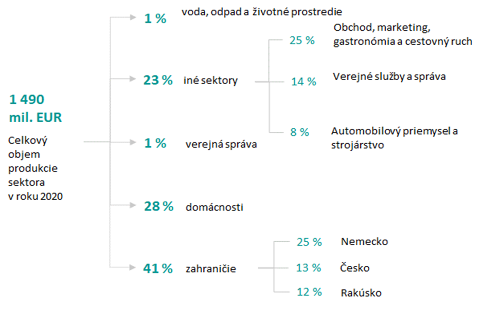 Najdominantnejšou kategóriou spotrebiteľov produkcie je zahraničie s 41 % podielom na celkovej spotrebe produkcie sektora. Do zahraničia smeruje 41 % produkcie, predovšetkým z divízie 38 Zber, spracúvanie a likvidácia odpadov; recyklácia materiálov, z toho je 97 % vstupom do ďalšieho výrobného procesu v zahraničí. Sektor tak produkuje 35 % pre domácu finálnu spotrebu, 1 % pre finálnu spotrebu v zahraničí, 24 % pre domácu medzispotrebu a 40 % pre medzispotrebu v zahraničí. Hlavnými spotrebiteľmi produkcie v zahraničí sú Nemecko, Česko a Rakúsko.