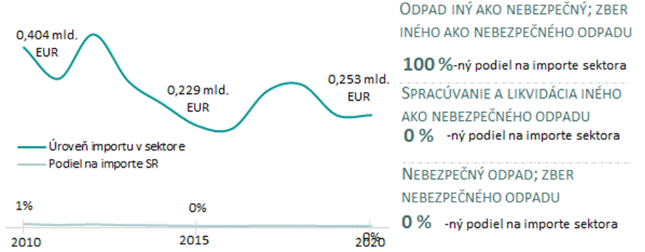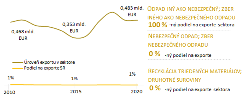 Sektor voda, odpad a životné prostredie má aktívne saldo obchodnej bilancie, to znamená, že vyvážame o 91 % viac produktov sektora ako dovážame. Podiel vývozu sektora na celkovom vývoze zo SR predstavuje 0,6 %. Dovoz produktov sektora predstavuje 0,3 % z celkového dovozu v SR a tento podiel klesá. Sektor patrí medzi 50 % sektorov s najvyšším vývozom a 50 % sektorov s najnižším dovozom v SR.