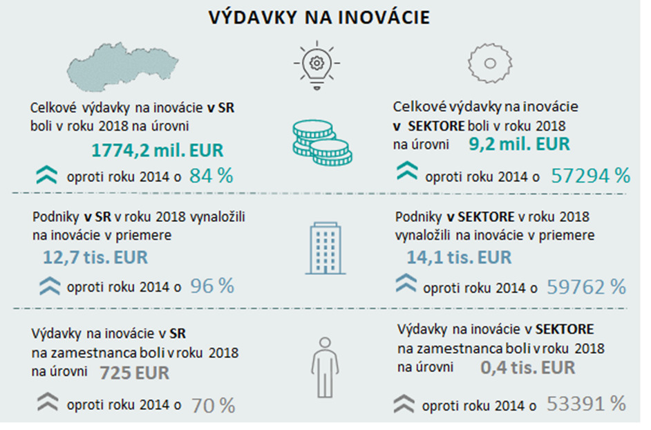 Sektor investuje do inovácií v priemere 14,1 tis. EUR na podnik, čo je o 11 % viac ako je národný priemer. Celkovo sa sektor podieľa na celkových výdavkoch do inovácií v SR 1 %-om.