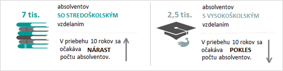Vo vzťahu k potrebám trhu práce sa očakáva nedostatok absolventov SŠ (pokryjú cca 67% pracovných príležitostí vhodných pre absolventov) a na druhej strane prebytok absolventov VŠ prichádzajúcich na trh práce. V súčasnosti pracuje na stredoškolských pozíciách až 1/3 absolventov VŠ. Do roku 2025 sa očakáva nedostatok absolventov najviac v zhluku zamestnaní sociálno-výchovní pracovníci, asistenti, opatrovatelia a vychovávatelia.