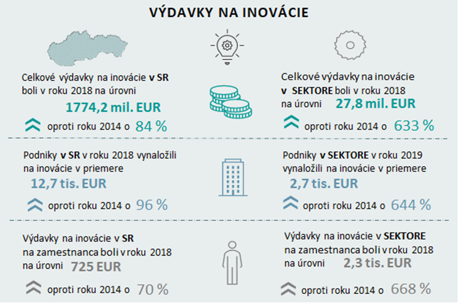 Nemenej dôležité sú inovácie. Sektor investuje do inovácií v priemere 2,7 tis. EUR na podnik, čo je o 78 % menej ako je národný priemer. Celkovo sa sektor podieľa 2 % na celkových výdavkoch do inovácií v SR.