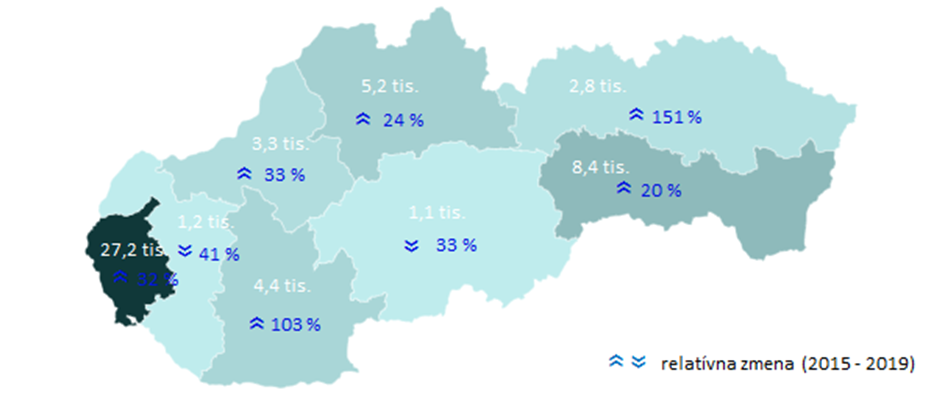 Až 51 % zamestnancov sektora pracuje v Bratislavskom kraji, kde má sektor 5 % podiel na celkovej zamestnanosti kraja. Spolu s Košickým a Žilinským krajom tvoria77 % zamestnanosti sektora. Sektor ITaT sa najrýchlejšie rozvíja v Prešovskom kraji, kde za posledných päť rokov vzrástol počet zamestnancov o 151 %. Najnižší počet zamestnancov sektora je v Banskobystrickom kraji.